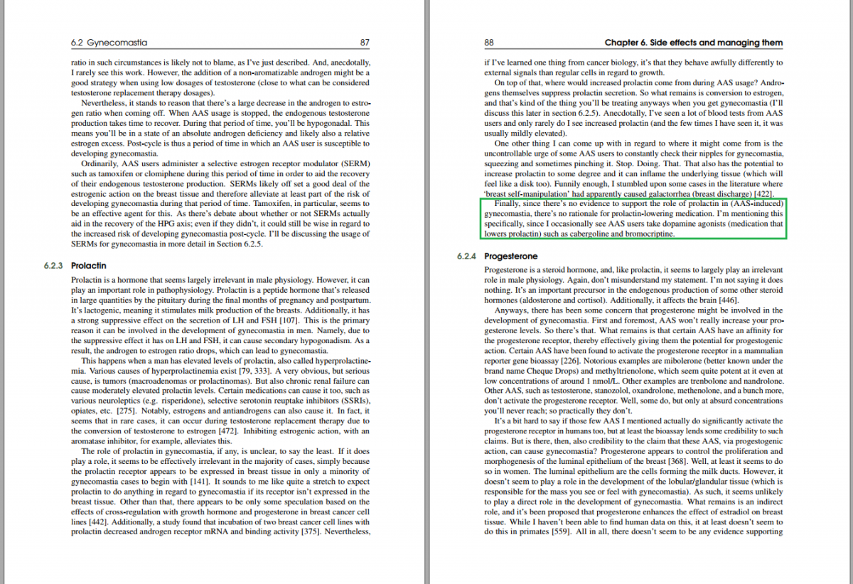 Die borstvorming is secundair aan het door prolactine-geïnduceerde hypogonadisme. Daar is géén sprake van tijdens een kuur. Ook dat staat letterlijk in die twee bladzijdes: "Additionally, it has a strong suppressive effect on the secretion of LH and FSH. This is the primary reason it can be involved in the development of gynecomastia in men. Namely, due to the suppressive effect it has on LH and FSH, it can cause secondary hypogonadism. As a result, the androgen to estrogen ratio drops, which can lead to gynecomastia." Ik noem ook specifiek een prolactinoom als voorbeeld van een oorzaak van een verhoogd prolactineniveau.Zo zeker zou ik het niet willen stellen. Zuiver geredeneerd, zelfs hoge oestrogeen spiegels geen relatie tussen. Neemt niet weg dat het wel gebeurd, schijnt zo te zijn dat je er gevoelig voor moet zijn. Anders gezegd dat heel veel mannen het niet krijgen wil niet zeggen dat het niet zo kan werken. In de literatuur is er voldoende aanwijzing dat het wel zo kan zijn als je er gevoelig voor bent.