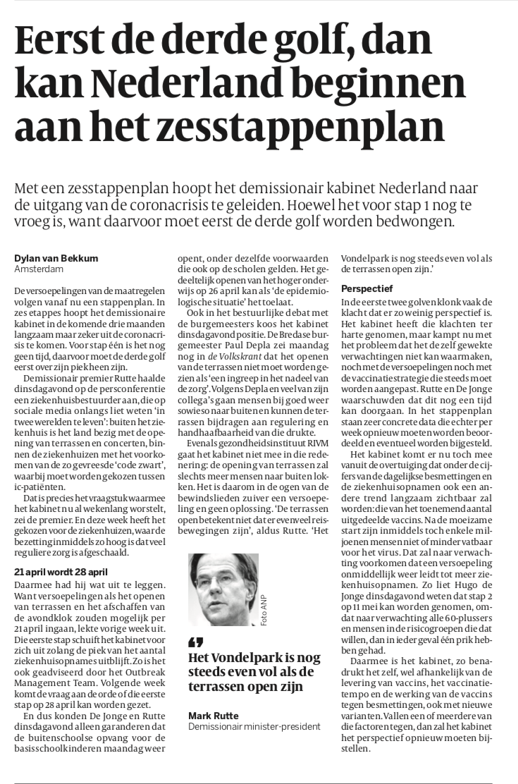 Ik snap dat ze het doen, ik snap dat ze het ergens ook wel moeten doen, maar na al die eerdere plannen waar binnen de kortste keren van werd afgeweken is enige scepsis toch niet vreemd.Dat is het idee van een plan nietwaar. Het alternatief is geen plan presenteren en dan heeft bij voorbaat niemand enig perspectief. Er zijn veel variabelen, modellen en factoren die van invloed zijn. Maakt het lastig. Wat overeind blijft is dat het vaccineren door moet blijven gaan. De rest zal op termijn volgen.