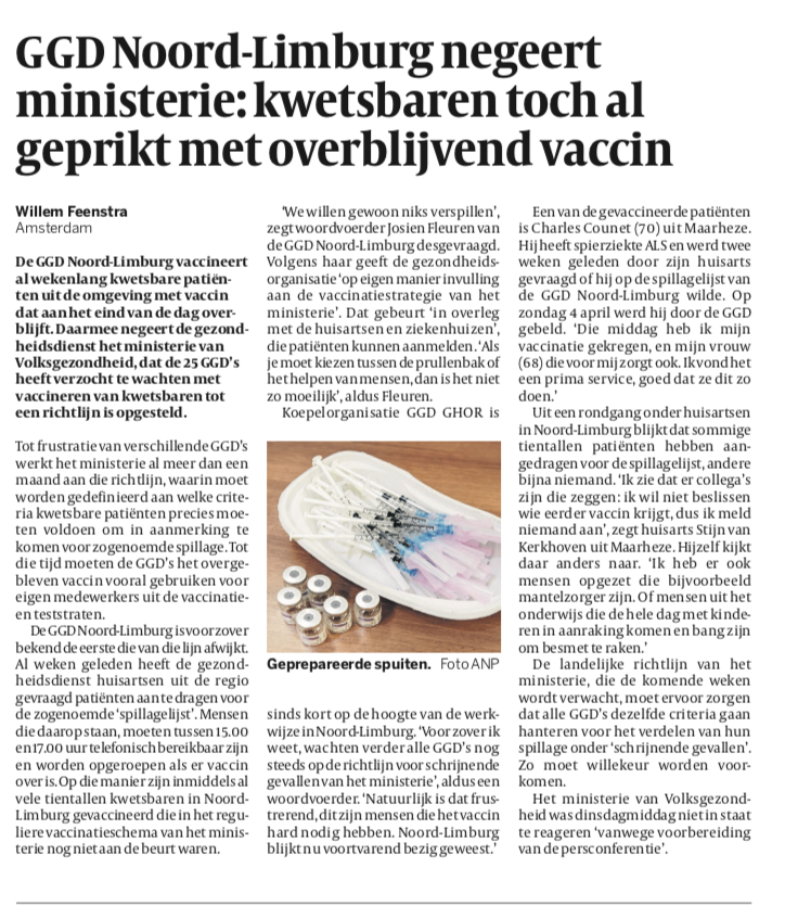 Eens. De reactie van het ministerie van Volksgezondheid was overigens exemplarisch. (Niet in staat te reageren 'vanwege voorbereiding van de persconferentie'.)Dat derde artikel wilde ik dus net posten. De GGD Noord Limburg heeft zelf maar besloten wat ze met die overgebleven vaccins doen omdat ze al een maand wachten op een duidelijke richtlijn vanuit het ministerie. Terecht natuurlijk, maar wel bizar dat het ministerie er niet in slaagt om binnen een maand een richtlijn te bedenken en uit te rollen. Als zelfs de GGD gaat muiten, wordt het wel heel duidelijk dat Hugo faalt.