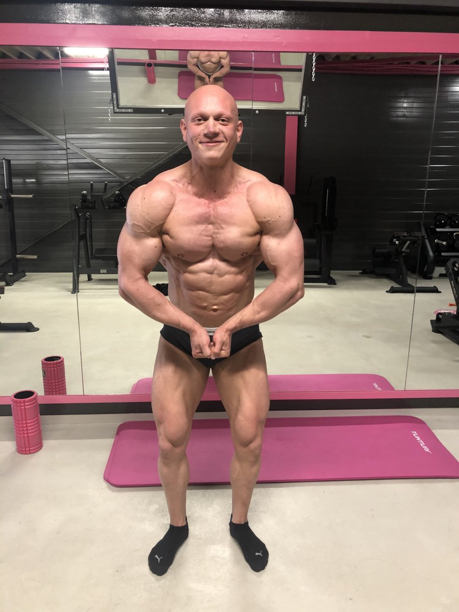 Kan je geen foto’s van jezelf laten maken in een lat spread of front double bicep of MM? Ben ik wel benieuwd naar. Van dit soort mirror selfies worden we niet veel wijzer.