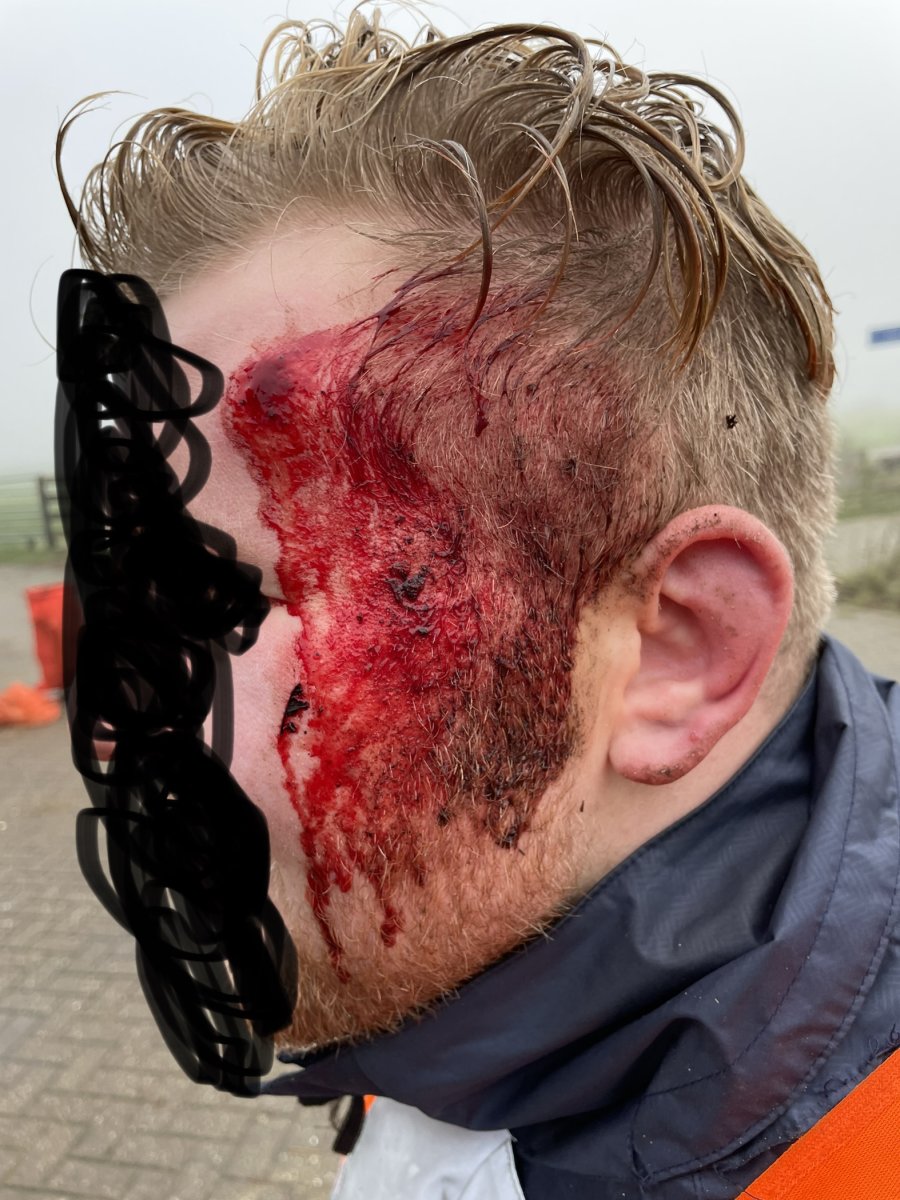 De begeleiding brengt hem naar de grond, en dan heeft hij er een handje van om z’n hoofd een paar keer expres op de grond te stoten of over de grond te schuiven.