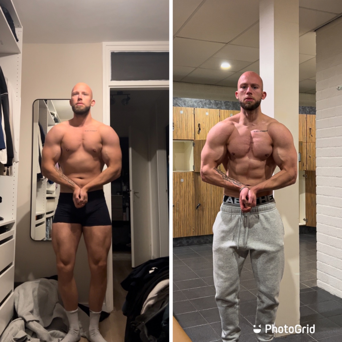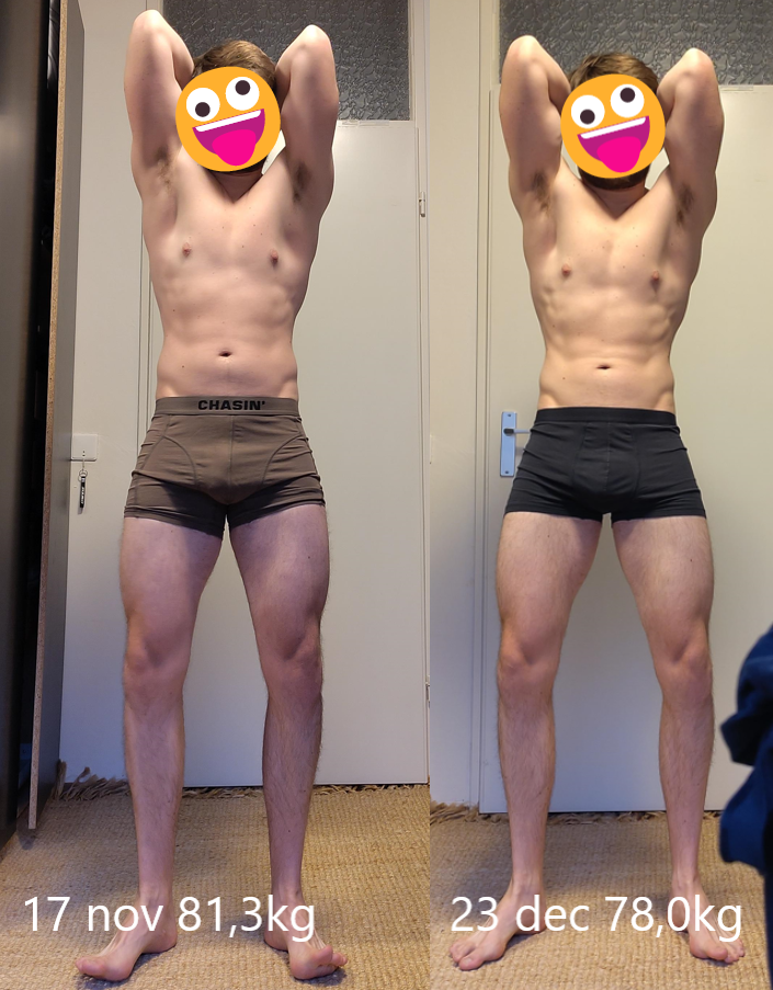 Vond verschil tussen onderstaande foto's wel nice. Vanmorgen voor het eerst onder de 77kg gedoken na weekje ziek zijn (whoah). Ff kijken hoe lang we door gaan met cutten, denk tot 74-76kg range afhankelijk van performance op mn lifts.