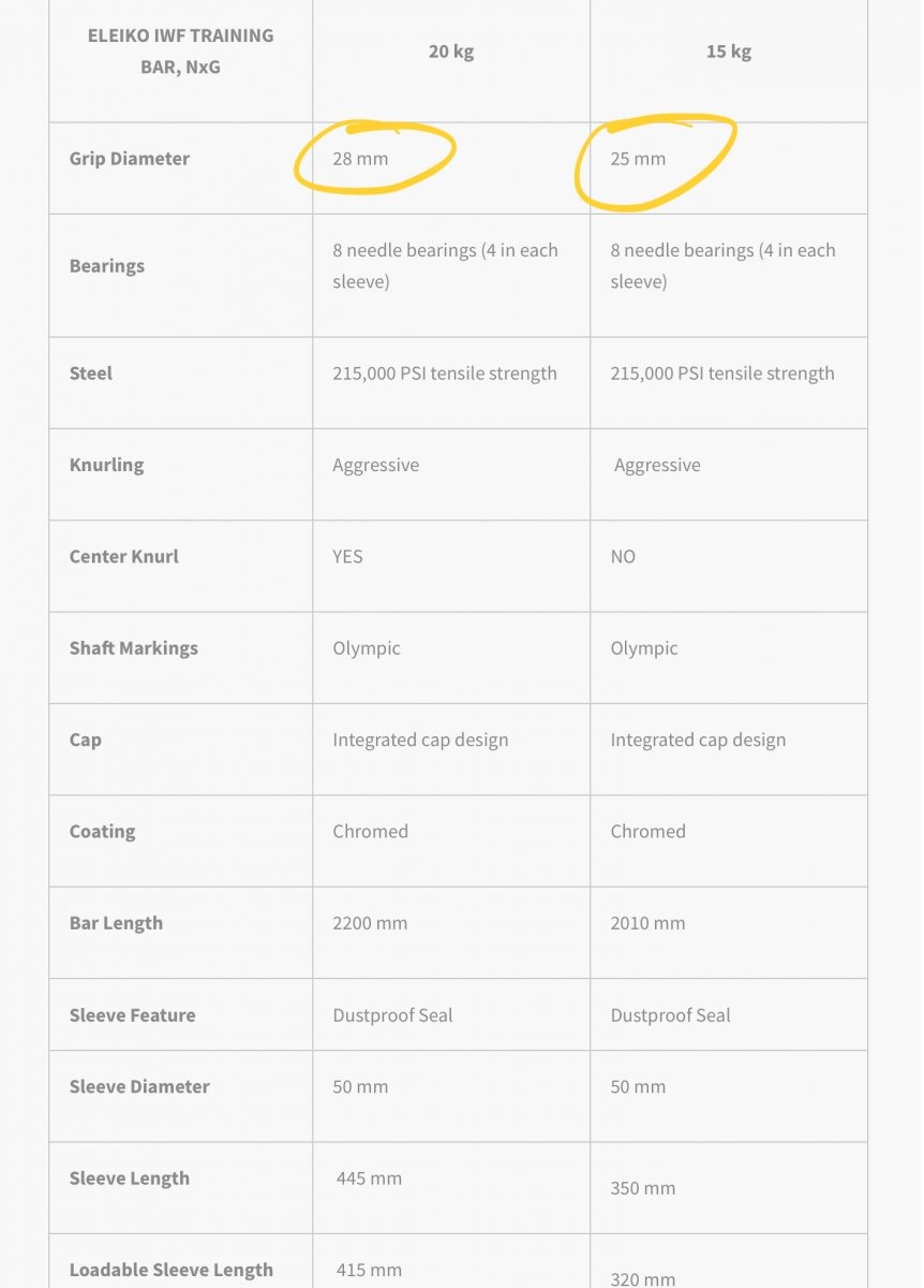 Alle websites behalve FS (Gorilla, Helisports, Fitnesskoerier) zeggen helemaal niets over de diameter van het grip gedeelte (alleen over opname gedeelte).Ik had alleen bij 50 mm stangen gekeken, volgens mij is al het 30 mm spul dikker qua omtrek met 29 mm. Wellicht toch eens overwegen om naar de oly standaard over te stappen, dat scheelt je echt een pak in kwaliteit en het traint gewoon veel lekkerder. En de stangen zijn dunner!