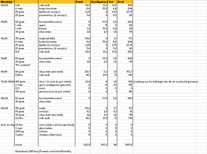 Ik heb even een schema gemaakt van wat ik op een dag eet (heb zowat geprobeerd alle tips van op dit forum te volgen). Ik vermoed dat ik iets te hoog zit in eiwitten dus ik kan er gerust wel wat shakes aflaten. Veel van jullie gaan zeggen dat ik misschien erg eentonig eet maar ik moet roeien met de riemen die ik heb (ben nog student) en eten wat er thuis in huis is, ik heb namelijk geen geld om kip, kalkoen en biefstuk te betalen voor mezelf elke dag. Vandaar dat ik erg veel haver en tonijn eet (erg betaalbaar