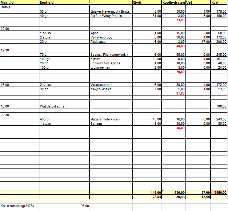 Verdeel de porties carbs (dus havermout en rijst) zo gelijk mogelijk. Stem je porties carbs zo af dat je in totaal ongeveer 2800kcal hebt (als dit te weinig is verhoog je je carbs zodat je bijv 3000kcal hebt)