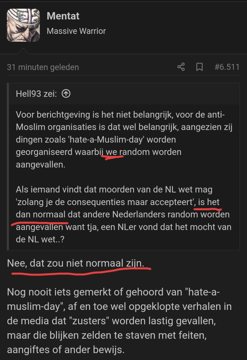 Wat mij betreft sloeg het op je hele post, anders had ik die wel in stukjes gehakt en ertussen gereageerd. Ik vond het belangrijk om daarmee te beginnen.Jouw 'nee dat zou niet normaal zijn' was nav mijn laatste vraag of het normaal zou zijn als een NL iets zou doen..