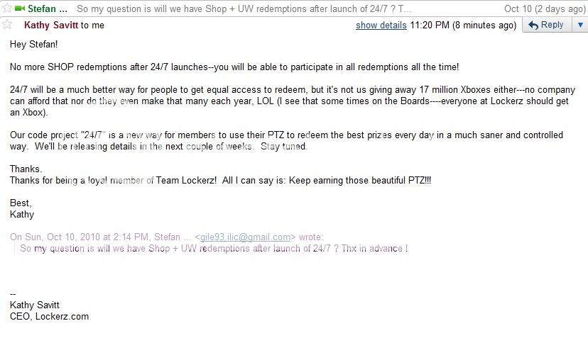 24/7 Update: We're almost ready to launch Lockerz 24/7! It's taken a lot of hard work, planning and member feedback to shape the new program and we're excited to finally release yet another way for members to use their PTZ in addition to SHOP (up to 100% discounts) and surprise prize redemptions.