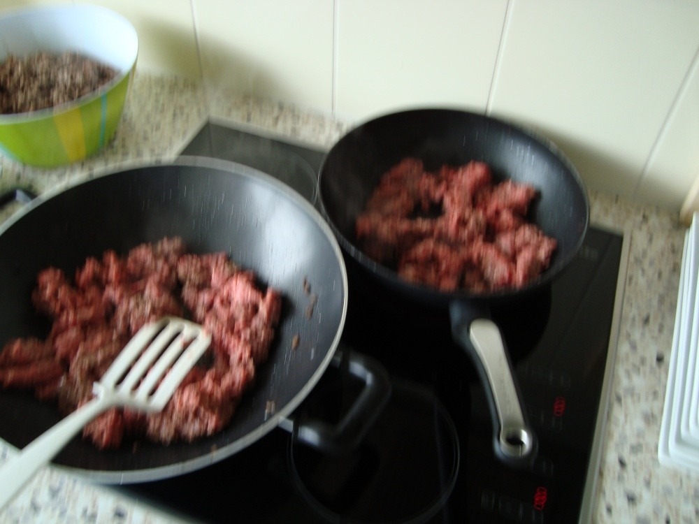 Het meeste werk zit in het koken van het voedsel. Hiervoer ben ik vandaag begonnen ben nu bezig 5kg gehakt aan het bakken voor de hele week.