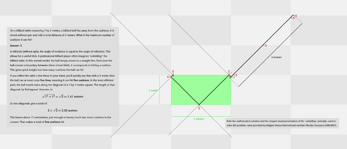 9. Op een biljarttafel van 1 bij 2 meter ligt een biljartbal, met gewone afmetingen, los van de band. Hij wordt zonder effect weggestoten en rolt vervolgens 3 meter. Hoeveel banden kunnen er maximaal geraakt zijn?