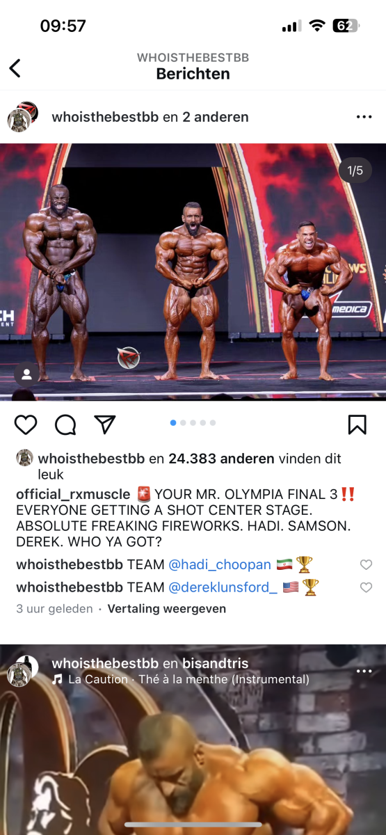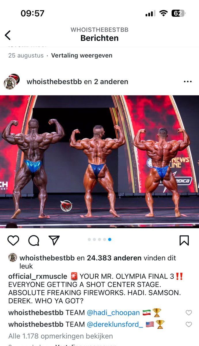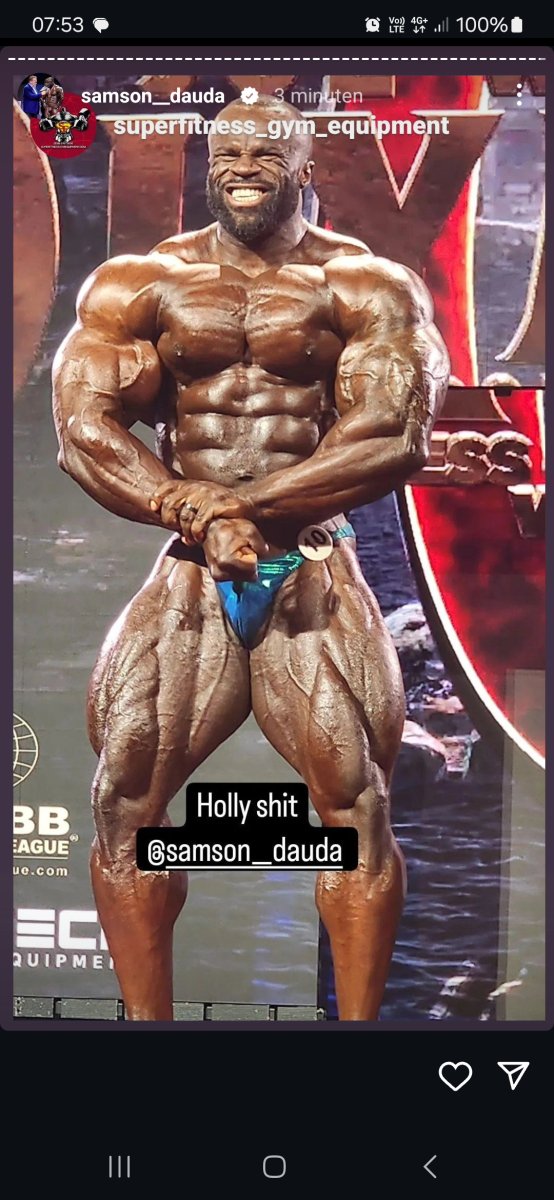 Hij is geen Hadi qua conditioning maar stond nog nooit zo goed als nu, vind ikVan wat ik gezien heb. Samson groot, vol maar 4 weeks out. Derek, lijkt niet verbeterd, en slechte conditionering. Hadi pakt hem. Maar goed de final komt nog.