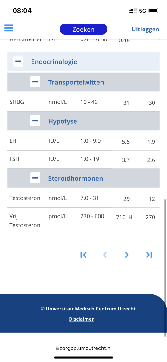 Uitslag van testesteron en vrije testesteron is nog niet bekend, althans, dit moet eerst beoordeeld worden voor het gedeeld wordt met mij.