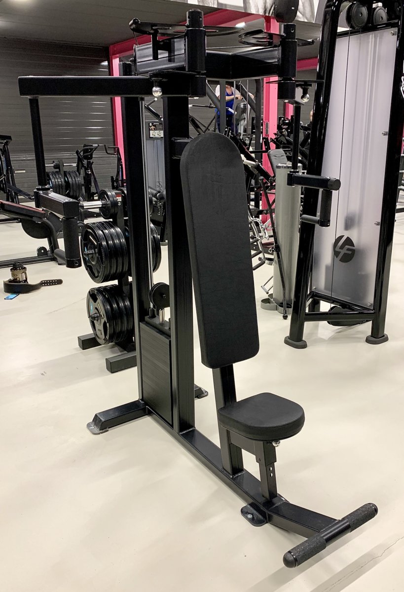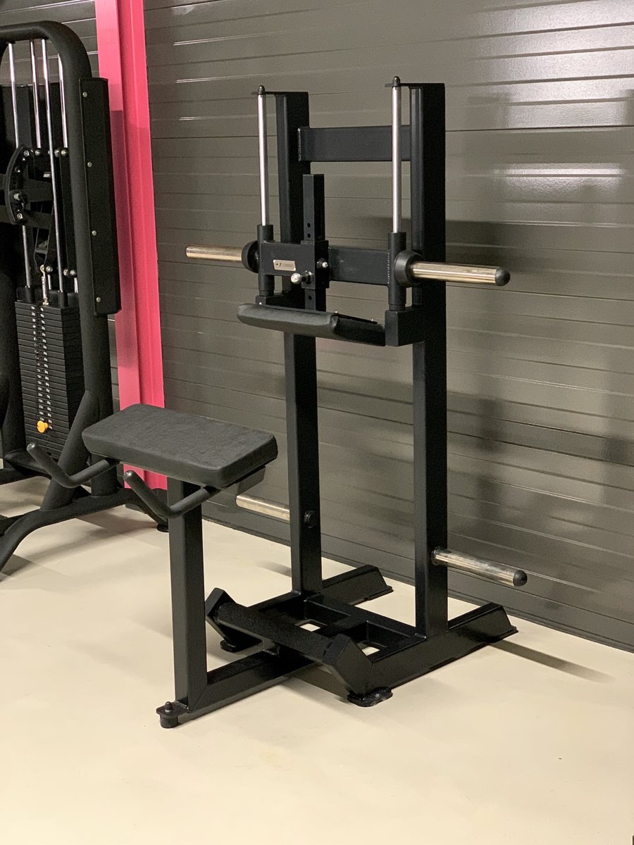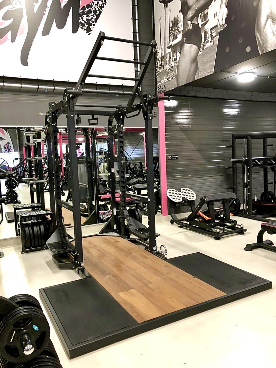 Machine crunch, Pec deck fly / rear delt, Donkey calf raise en een op maat gemaakt deadlift platform. Dit is door hetzelfde bedrijf gedaan als die onze bar hebben ontworpen. Echt heel mooi geworden!