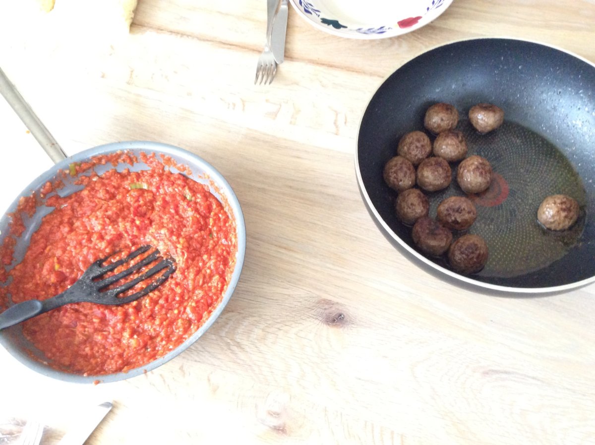 Bloemkool met tomatensaus dus.Arme man....tomatenrijst gemaakt met bloemkoolrijst. Gelukkig zijn er gehaktballen bij en geraspte kaas om het draaglijker ga maken. En Griekse yoghurt als toetje
