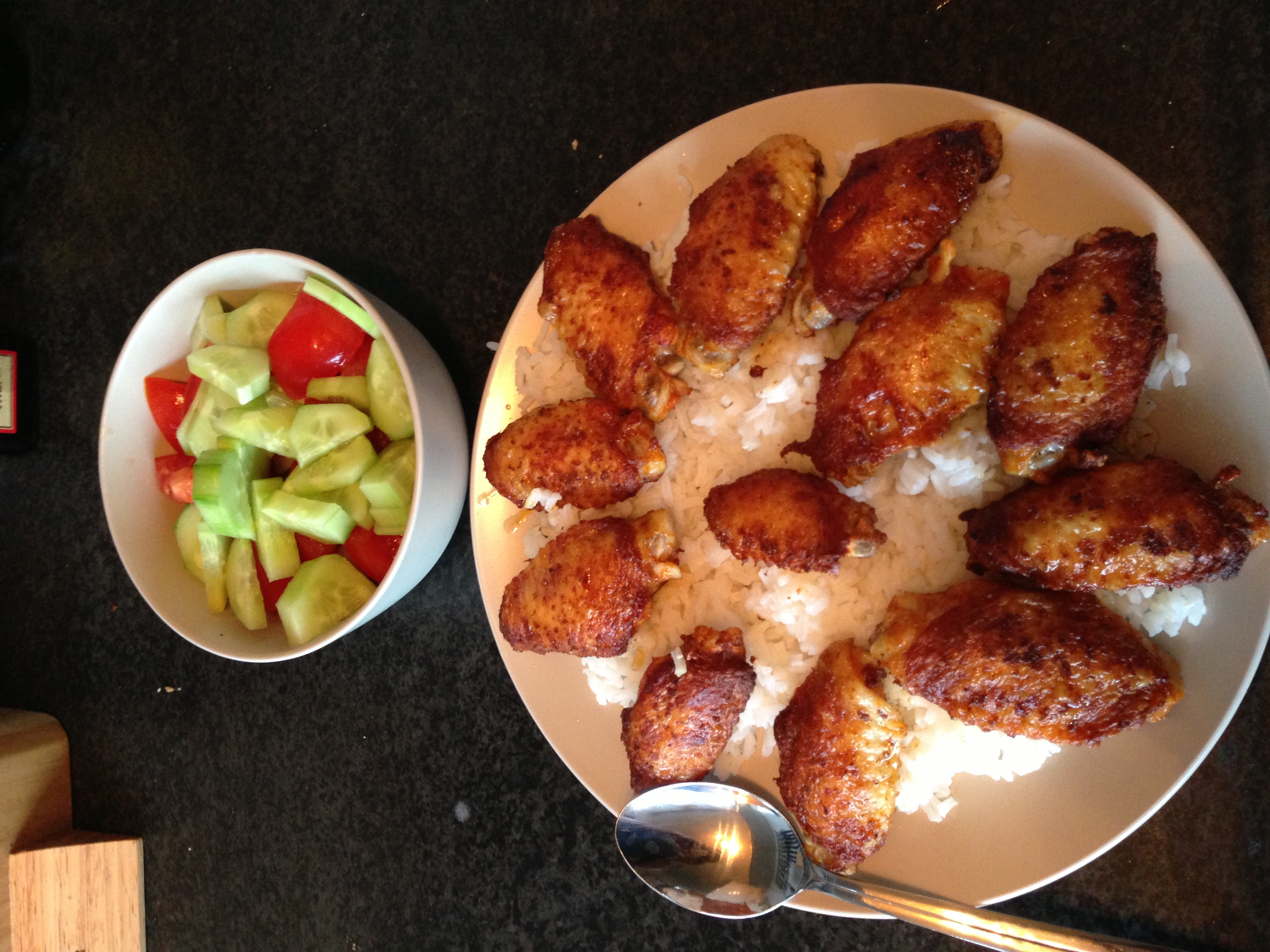 Dit wordt mijn beloning na hopelijk een goede training straks. Zilvervliesrijst + kip, gebakken in sesamolie met een zelfgemaakte kruidenpasta van honing, kaneel, kruidnagel, nootmuskaat, scherp paprikapoeder en verkruimeld laurierblad.