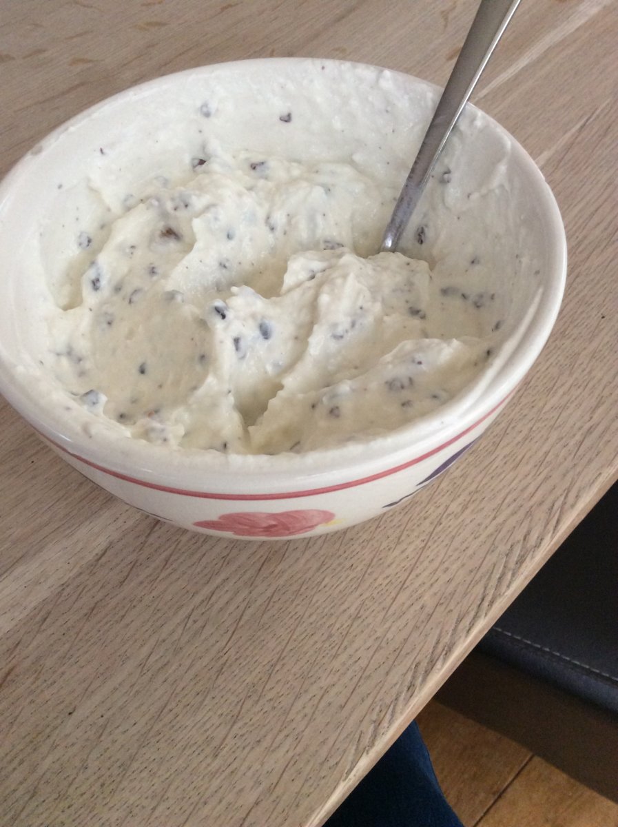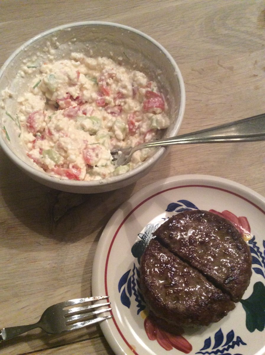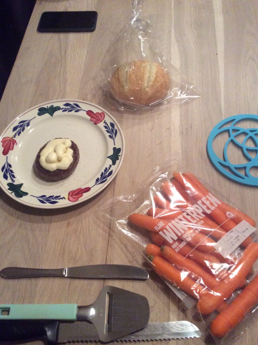 . Makkelijker te snijden dan gewoon een plak plat op het bord.Die kat heeft ook 1/3 van het vlees binnen gewerkt. Ze kijkt dan zo schattig en onschuldig dat ik niet kan weigeren