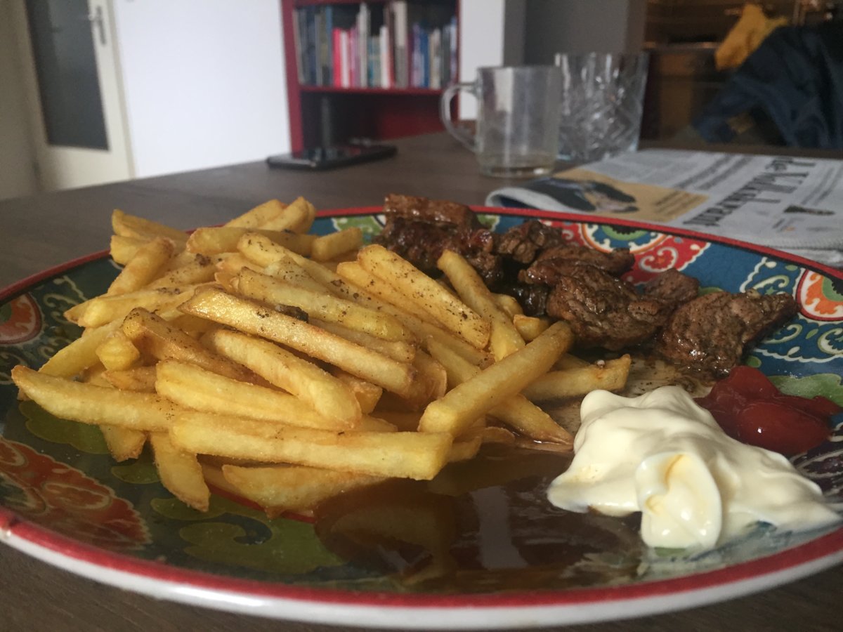 Hoe zit jij eigenlijk achter je buro? Was je in slaap gevallen?Shake onmiddellijk na het rennen, nu een boterhammetje met ham om te overleven tot aan de lunch.