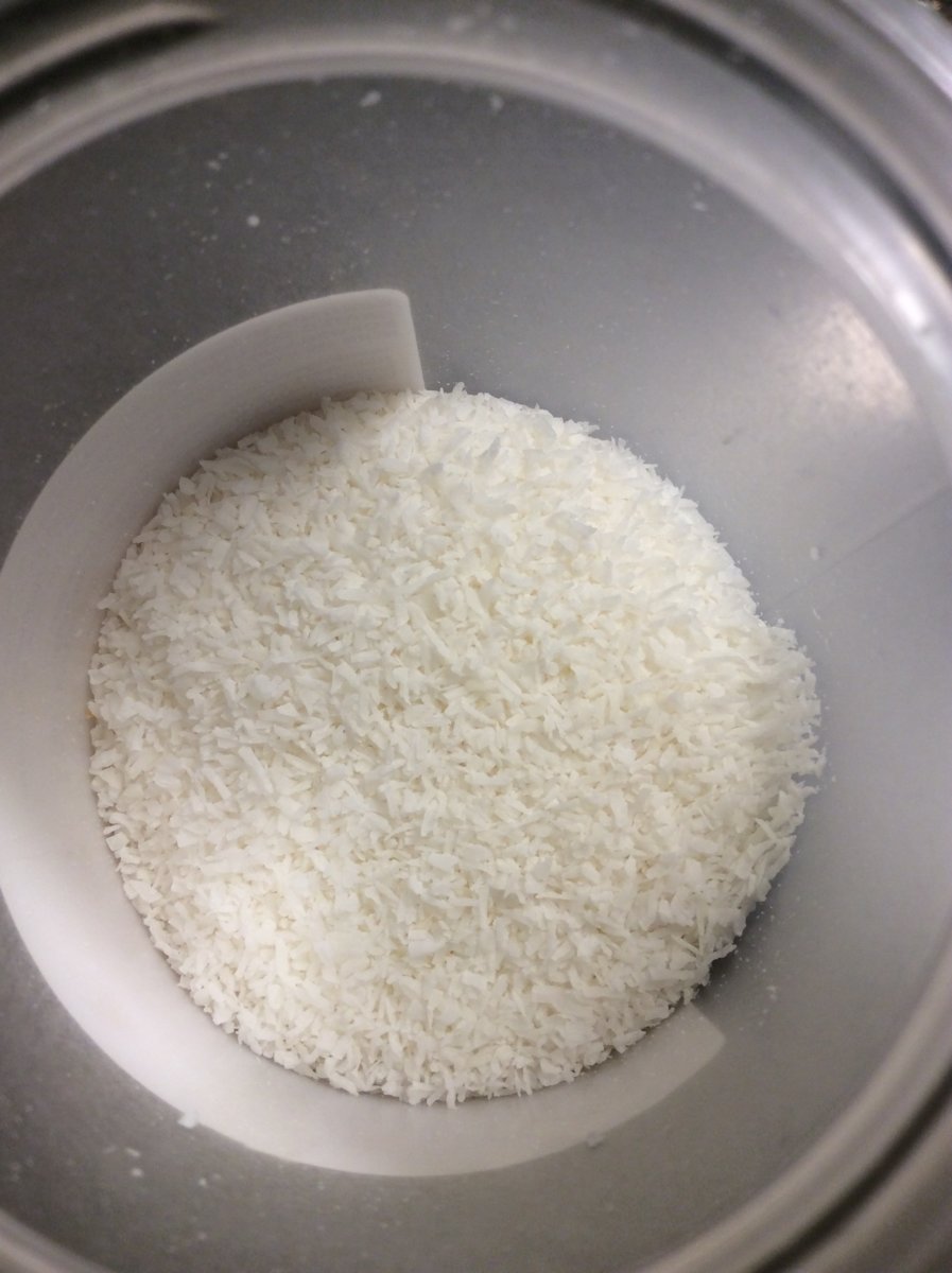Misschien heb je kokos schaafsel gekocht ipv kokosrasp ? Die stukjes zijn groter. En dan kan ik me er wat bij voorstellen. Mijn kokosrasp ziet er zo uit...Laats ook maar kokosrasp aangeschaft en dit door mijn kwark gemengd.