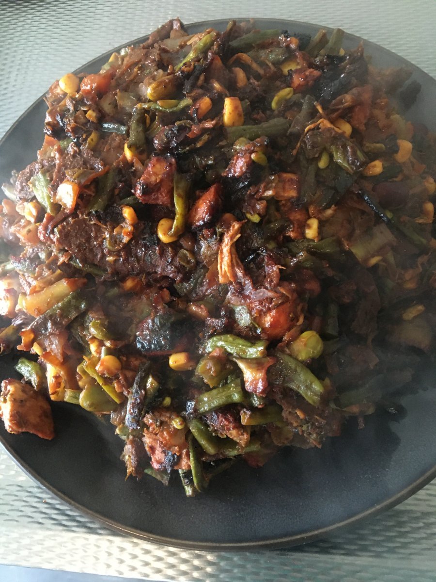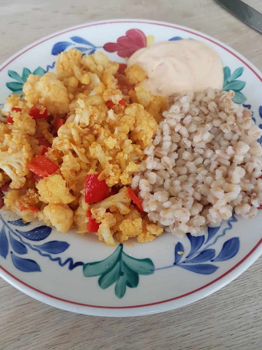 je moet alles proberen, en heeft vast lekker gesmaakt (als je honger hebt smaakt allesNiet fotogeniek. Rare maaltijd maar ik vind het lekker. Roerbak bloemkool met tarly en een yoghurt chili sausje