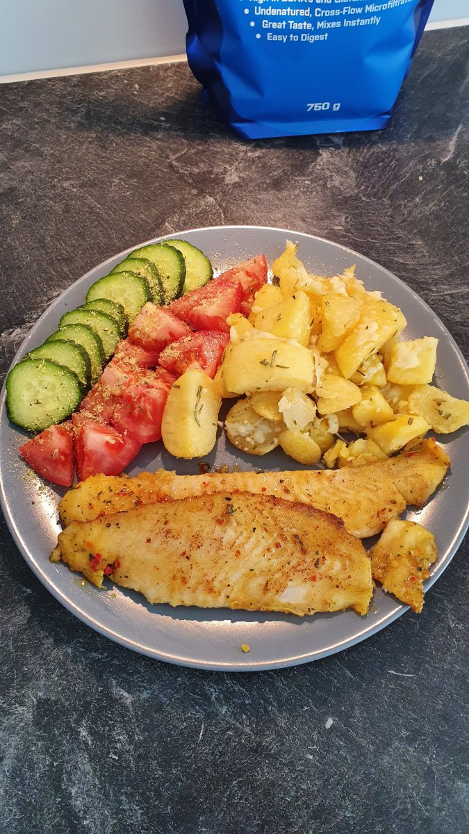 Panga met kerrie marinade, aardappel met rozemarijn en wat geraspte kaas uit de oven, en wat random tomaat en komkommer met Aromat![]()