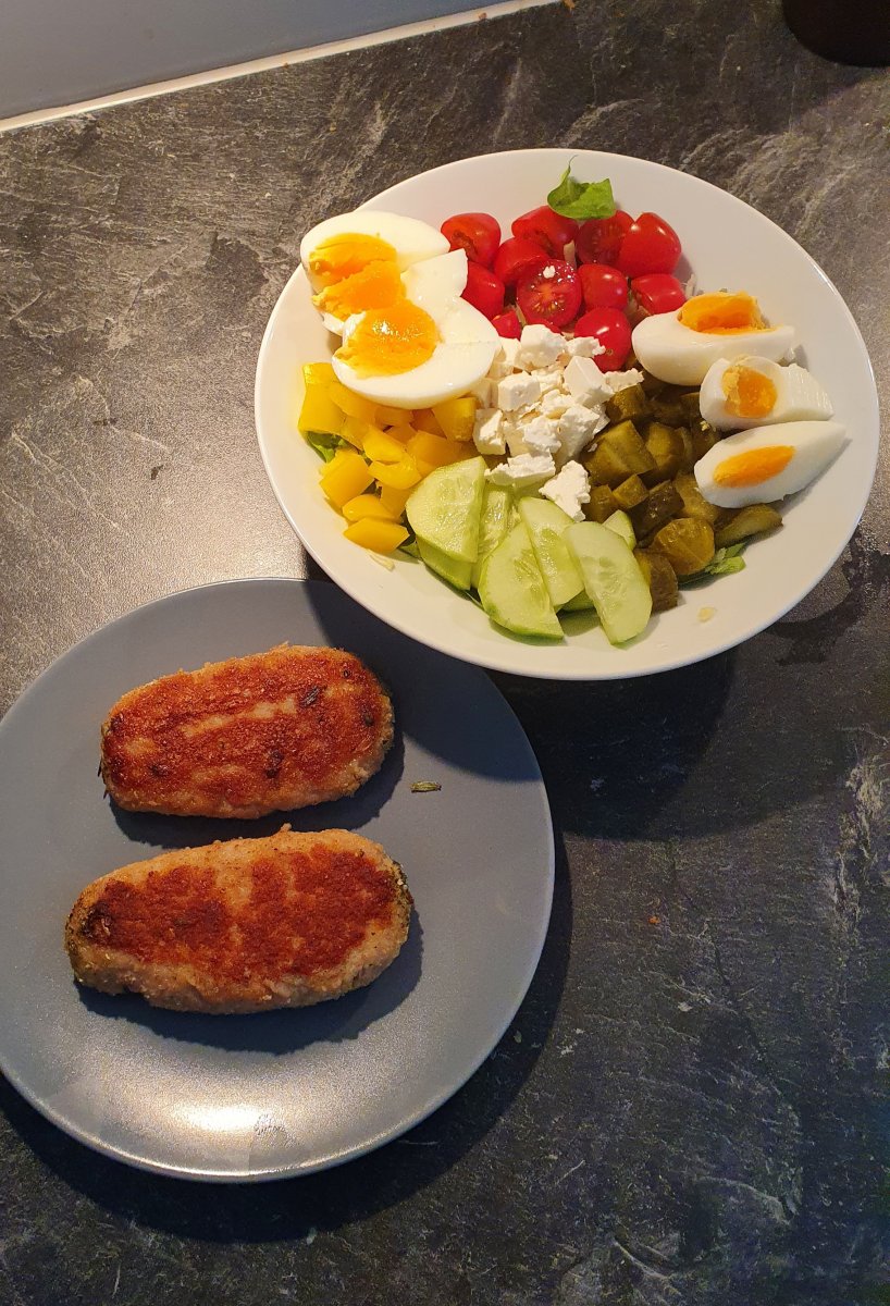 - In een kommetje 6 eieren, 210 gram ei-eiwit (6 eiwitten) en een zakje mix voor boerenomelet klutsen