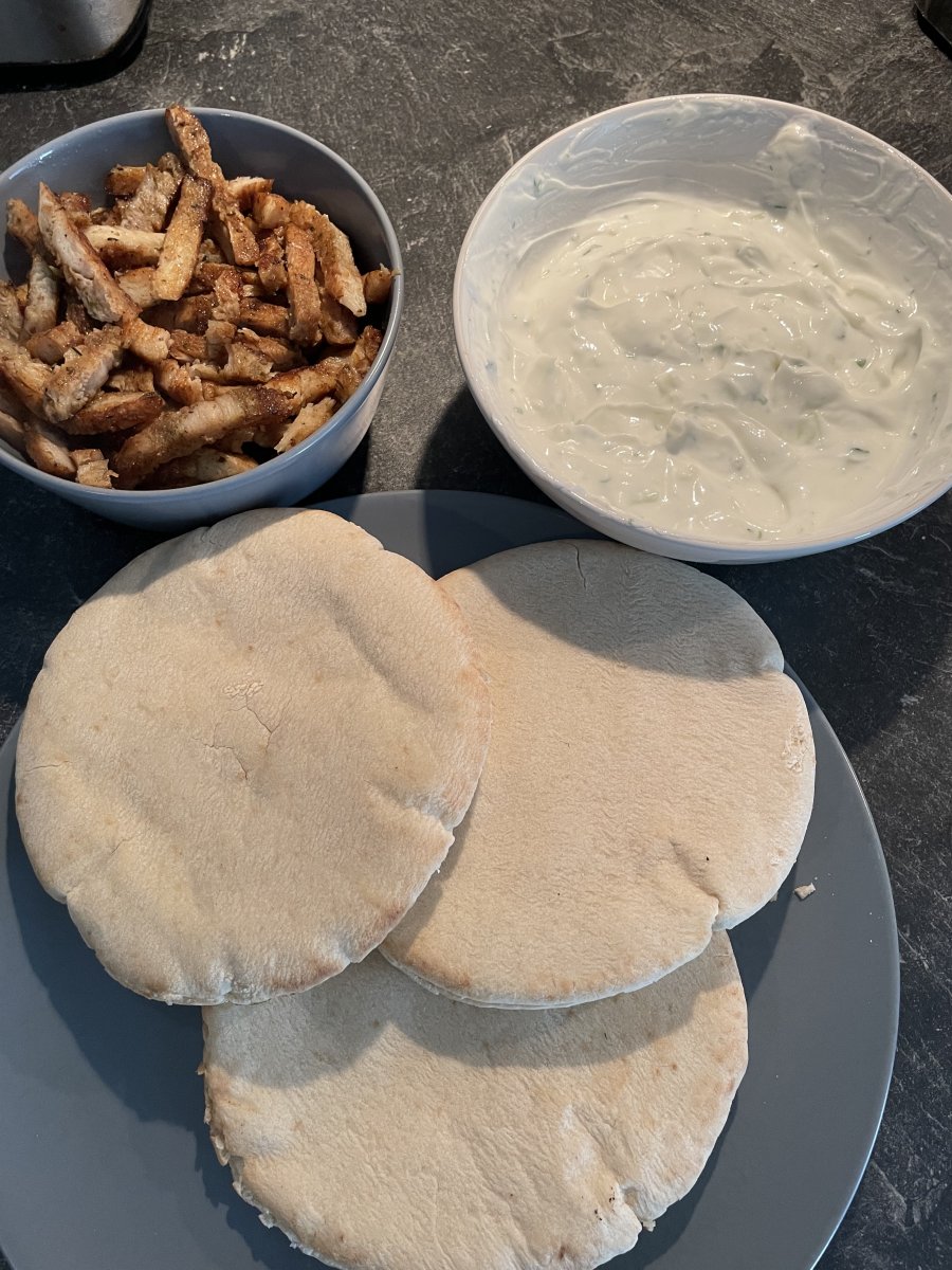 Musclemeat kipgyros, 3 pita’s en homemade tzaziki gemaakt met skyr yoghurt.