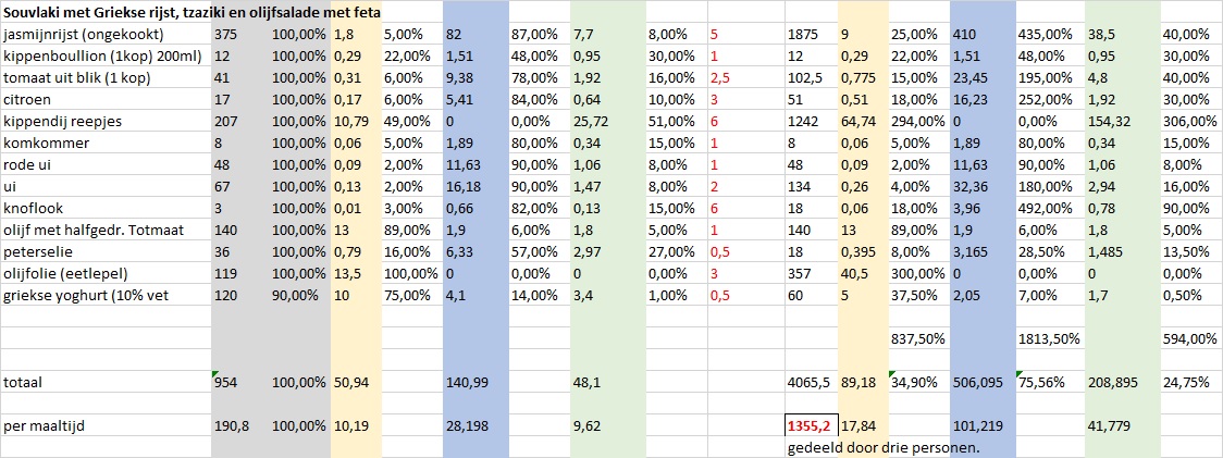 met getoonde hoeveelheden, gedeeld door drie personen kom je op 1355kcal pp.