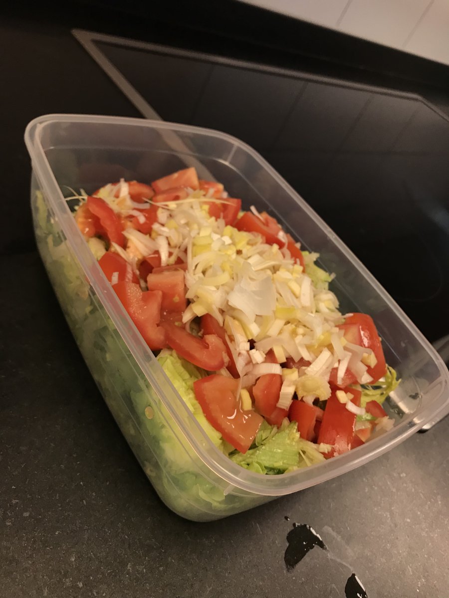 Nee 300g ijsbergsla, 2 tomaten, 38g preiZijn dat enkel groenten of ligt je vlees/kip beneden?