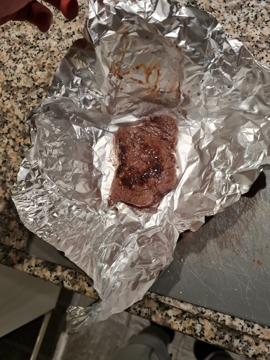 Oke thanks, hij was nu meer dan medium, dus volgende keer iets minder lang bakken. Dat van die sappen klopt, er lag een aardig bloedbad in het aluminiumfolie bakjeZo is goed. Je doet het om em te laten rusten. Dan verdelen de sappen zich weer en loopt je stuk vlees niet meteen leeg als je het aansijdt.