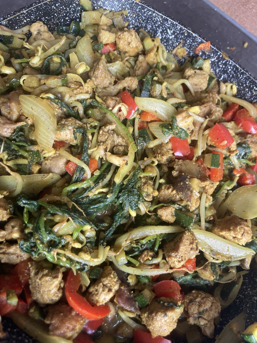 Ziet er goed uit! Wat zit er allemaal voor groenten in? Ik zie spinazie, ui, taugé, paprika, courgette, klopt? Doe je er ook iets van saus/kruiden oid in? En wat voor vlees(vervanger) is het?