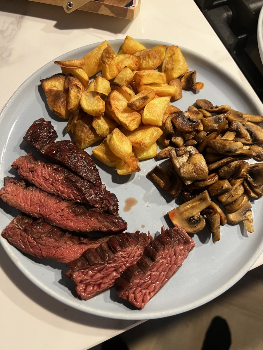 Lekker man, krijg alweer trek in eten 🤣Spreekt voor zich denk ik maar aardappels uit de oven, gebakken champignons en stukje bavette.