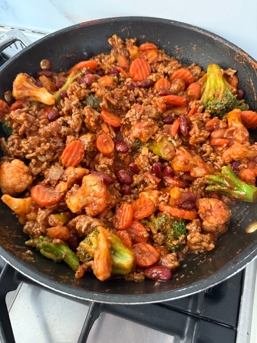 Je kan ook standaard (mager) kip- of kalkoengehakt eten. Dat doe ik 4x per week en 3x per week rund.