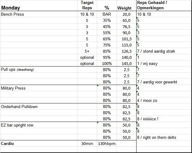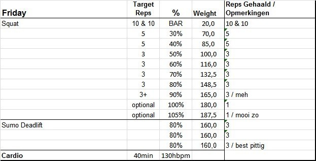 Ik heb tijdens de 10 weken maar 4 weken gesquat omdat ik het maximum uit m'n deadlift wou halen en zo fris mogelijk aan m'n coan trainingen wou beginnen. Met al die extra as. oefeningen uiteindelijk minder dan 5% van m'n squat 1RM moeten inleveren wat vooral te wijten was doordat ik moeite had met m'n techniek te handhaven na weken zonder squattraining.