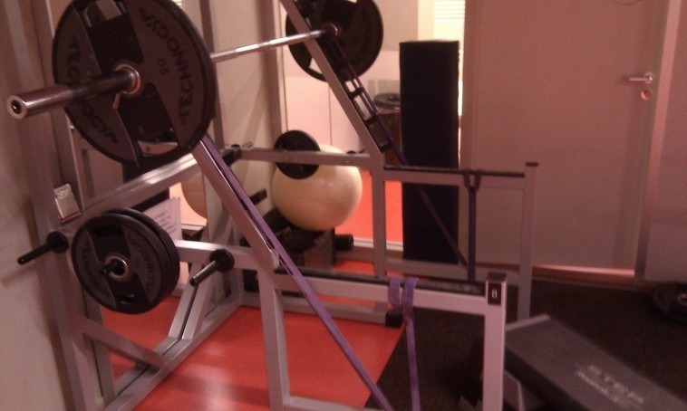 Op de gym is er een paarse en groene. De groene is een stuk strakker dan deze, ook een stuk breder. Ik schat dat deze 2 paarse banden samen het totaal zo een 30kg extra verhoogden (onderin). Ze waren overigens wel compleet gestretched bovenin, denk dat de groene bands daarvoor wat te zwaar zijn want deze gingen er al niet makkelijk op.