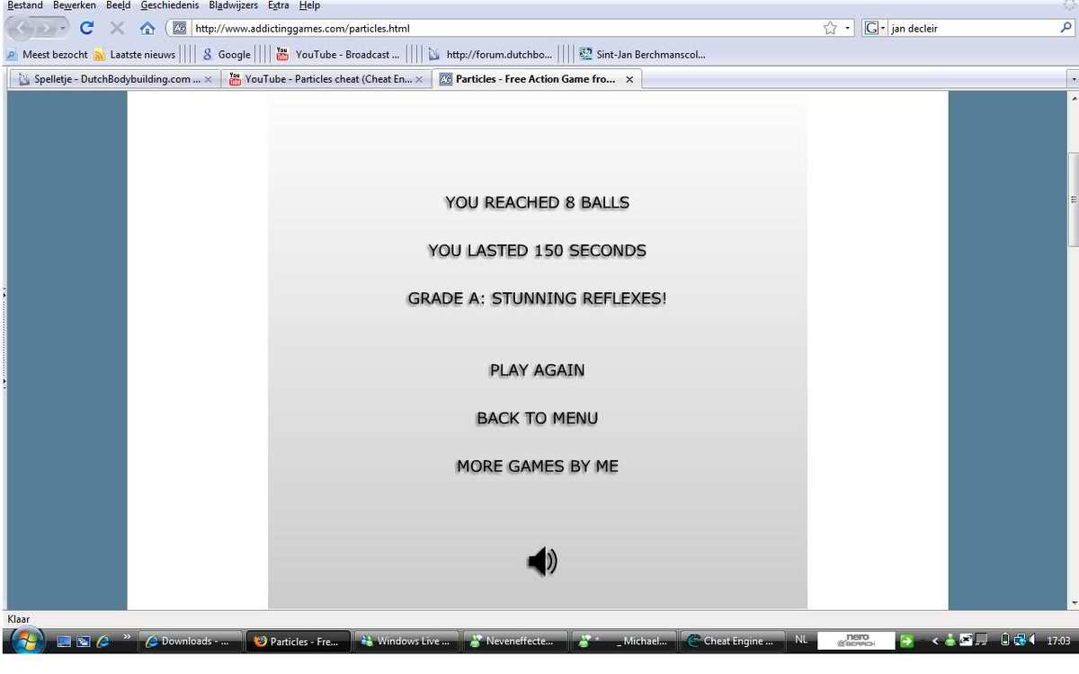 jeroenfijn Advanced Bodybuilder Lid sinds 6 jul 2006 Berichten 935 Waardering 0 Lengte 1m83 Massa 90kg Vetpercentage 8% 5 dec 2008 #29 indekay zei: Dit is ook zo'n verslavend spelletje: [Link niet meer beschikbaar] Klik om te vergroten... Klik om te verkleinen... Die is leuker mijn max is 15sec tot nu toe, maar je moet een beetje de bewegingen onthouden.