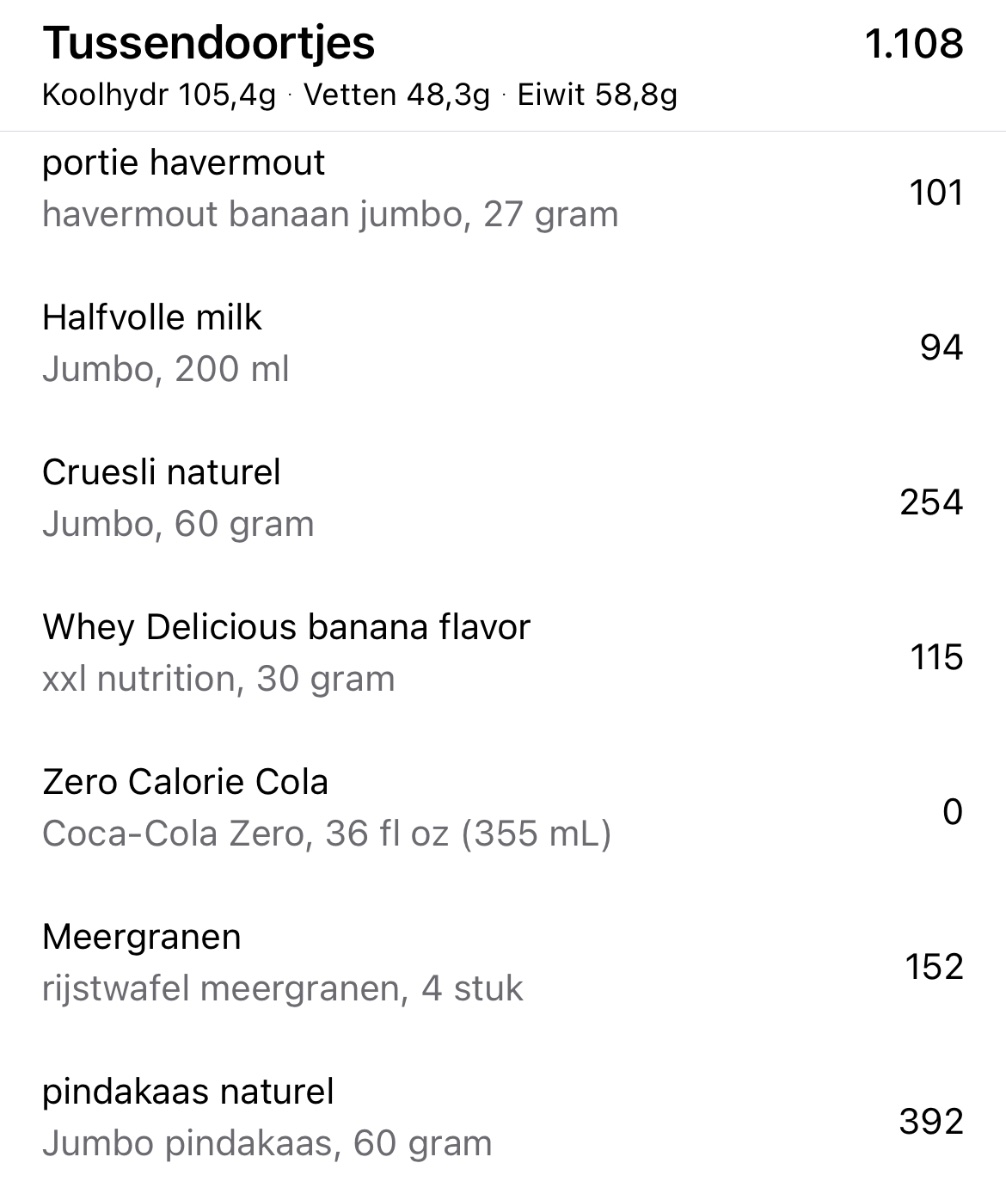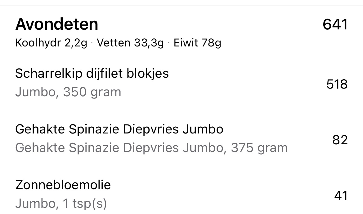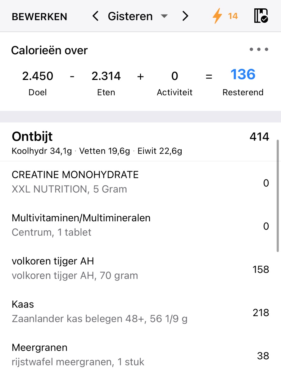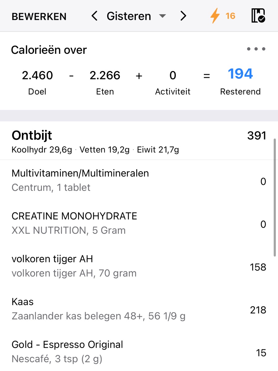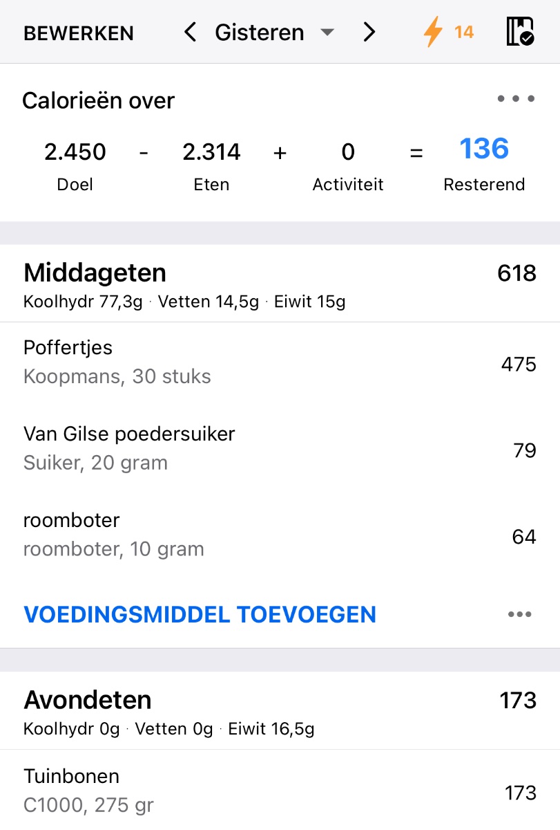 Ik probeer wel zo langzaam aan dingen te veranderen, bijvoorbeeld de tip om meer groenten te eten om zo verzadigd te raken. Dat zie je ook terug in m’n log (hoop ik). Suiker heb ik enorm teruggebracht (koffie zonder suiker en elke dag onder het max totaal van suiker op de app) - natuurlijk met uitzonderingen zoals de poedersuiker gisteren, maar nog steeds onder de maximale hoeveelheid suiker voor die dag.