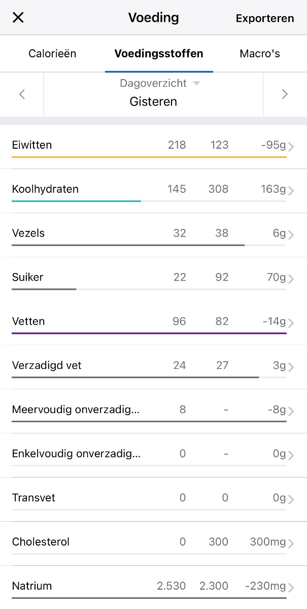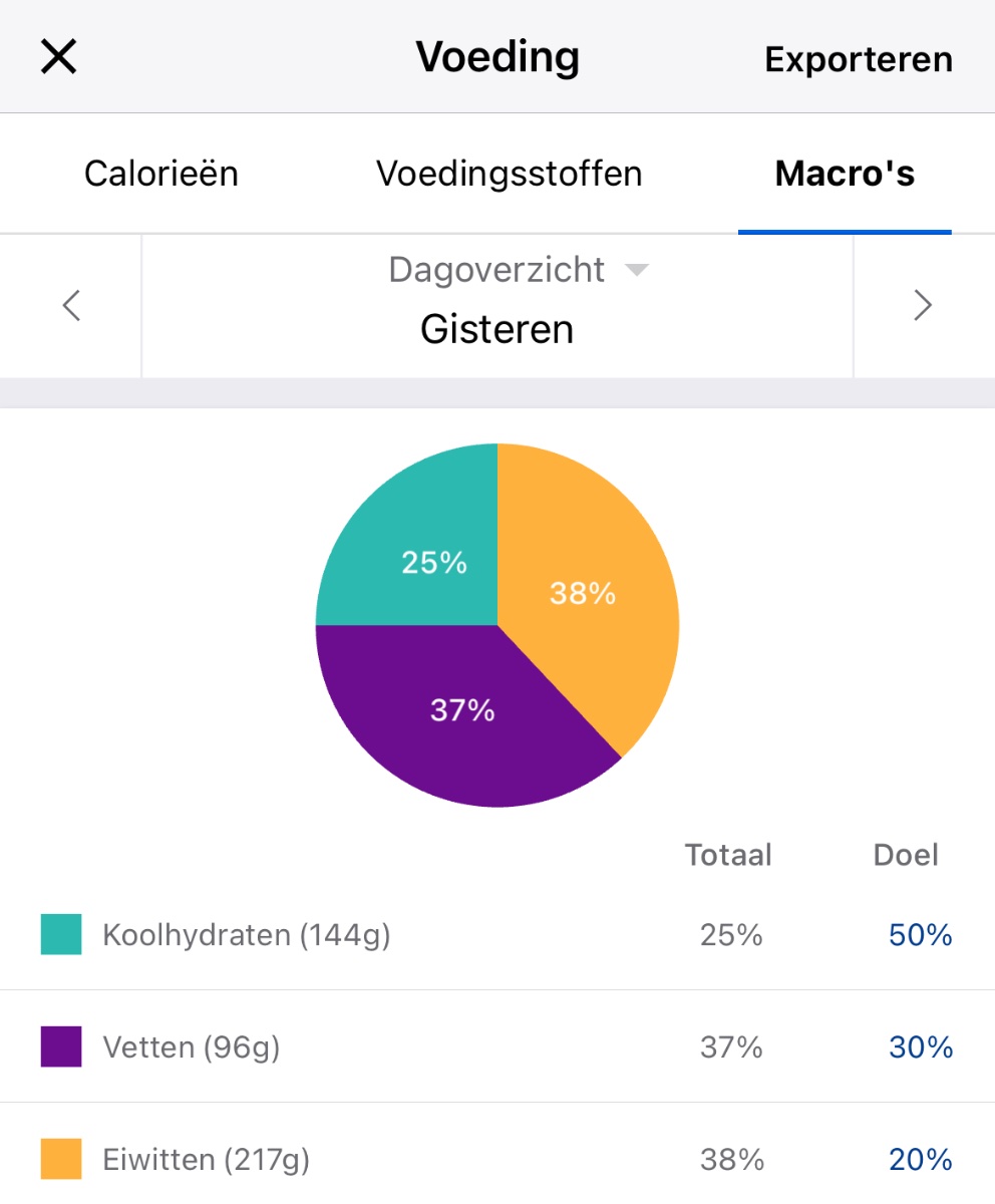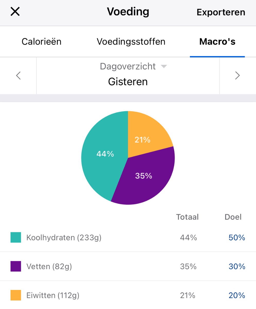 (Houd er wel rekening mee dat niet alle producten in mfp volledig zijn ingevuld qua macro's waardoor je irl soms hoger kan uitkomen dan dat de app zegt)