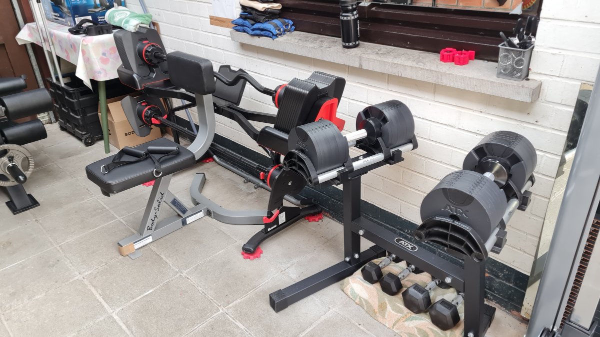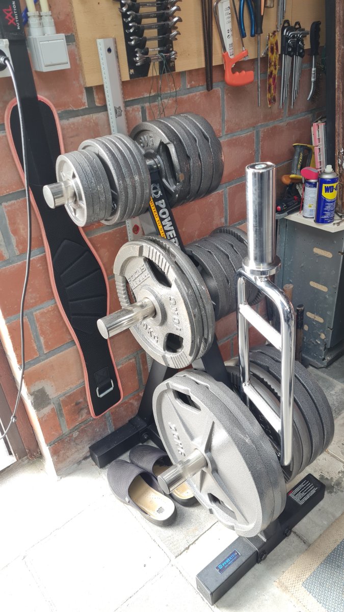 Prachtig. Zelf heb ik alleen een drukbankje, haltersteunen en een paar halters en dumbbells.