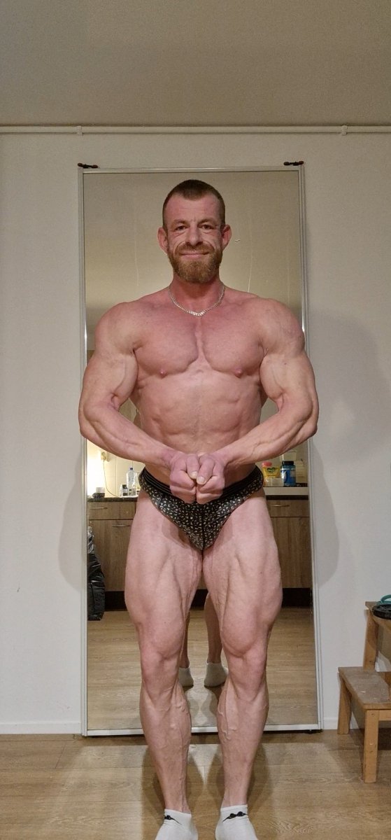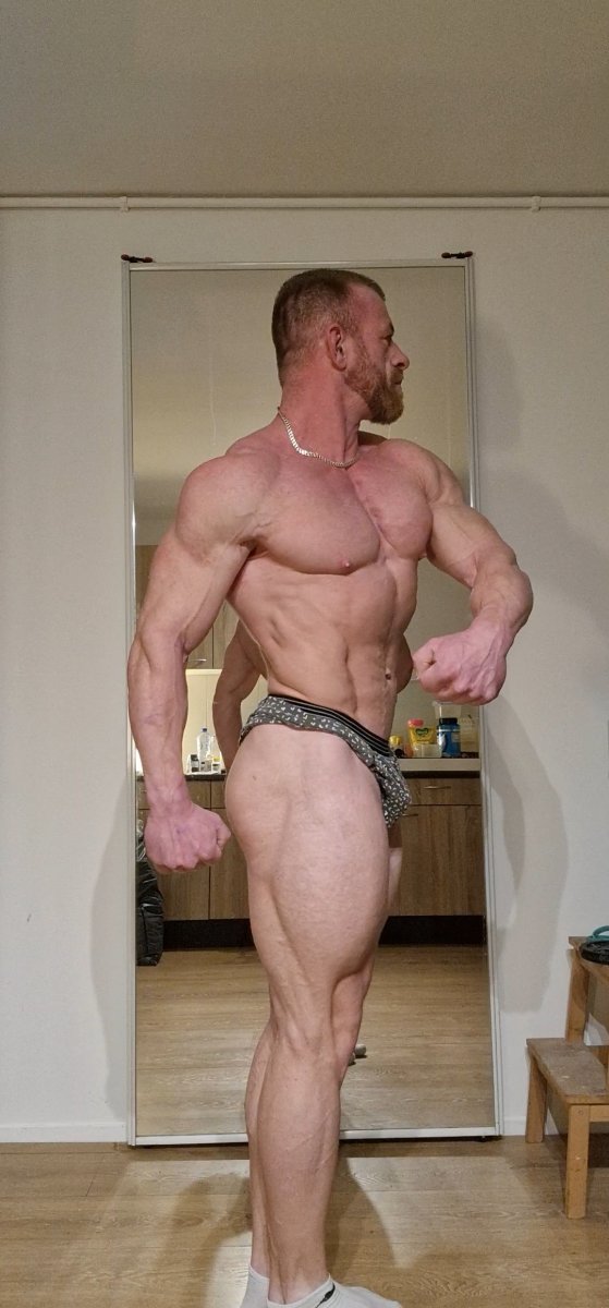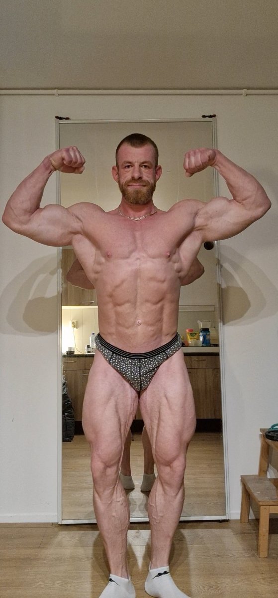 Ben nu 9 a 10 kilo zwaarder dan op showday 2 jaar terug en ik denk leaner zelfs nu.Je bent imo wel much improved man in vergelijking met 2 jaar geleden ofzo… Lekker. Quads zijn groter en voller, meer lats in de front double. Je chest ook aanzienlijk verbeterd.
