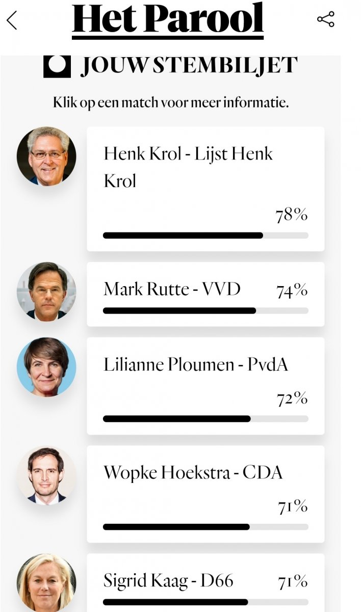 Hangt dat niet ook van het totale percentage af, anders heb je misschien wel heel weinig overlap (zoals mijn uitslag)?Wat doet 50plus in mijn stemwijzer advies, scheelt 2% met CDA. Nooit gedacht dat die (kennelijk) dicht bij elkaar zaten.