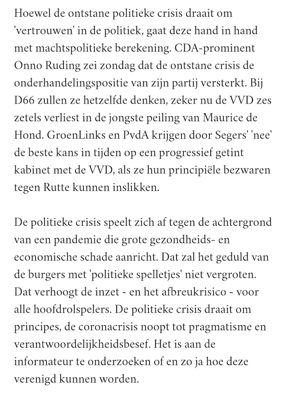 Vanuit een VVD standpunt bekeken zouden ze beter - na een ongetwijfeld hele lange formatie waarin alle mogelijke combinaties zonder VVD langs zullen komen én zullen klappen - toch een nieuw kabinet in gaan en proberen het zo lang mogelijk uit te zingen zodat het electoraat en ook de coalitiegenoten deze flater weer een beetje vergeten. Het lijkt er op dat kabinetsdeelname van de VVD alleen nog gaat lukken als Rutte er niet meer bij is.
