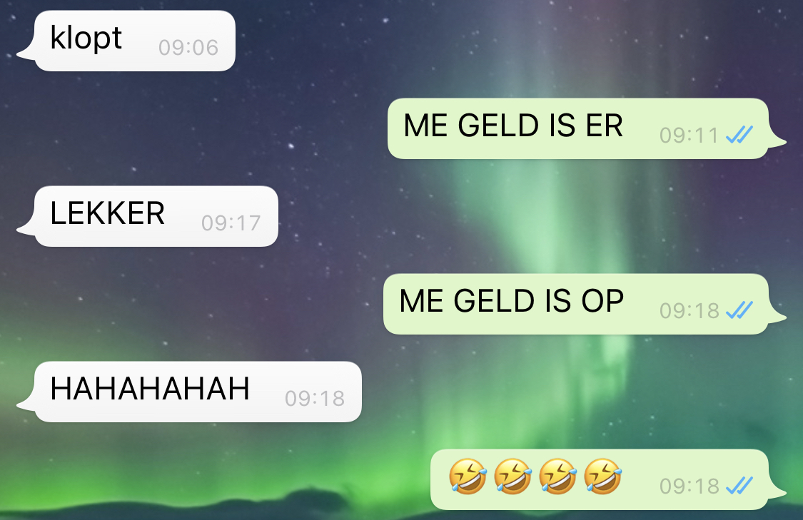 Ze heeft twee zonen. Ik logeerde bij haar. Toen ze een sms kreeg “mama ik heb mijn broek met gsm in de wasmachine gestoken hier is mijn nieuw nummer” dacht zij dat het om mijn broer ging. Even later kreeg mijn moeder weer en sms dat ‘hij’ niet aan zijn bankgegevens kon en of zij op dit random rekeningetje geld kon storten. En ze heeft dat twee keer gedaan.