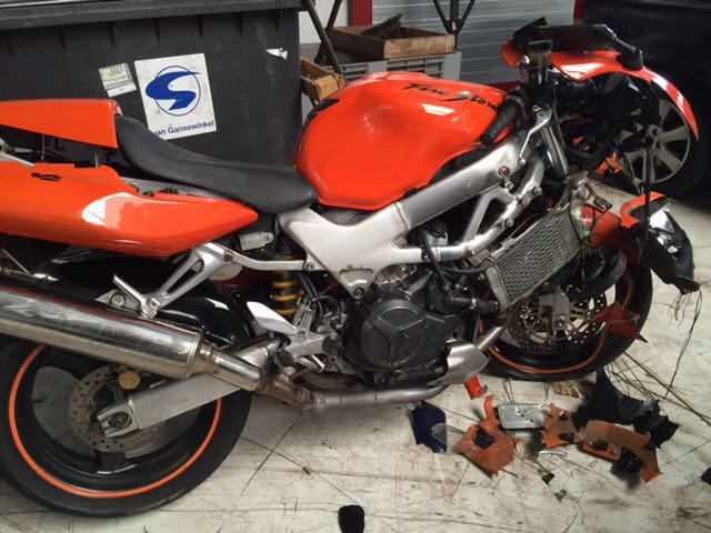 Achterkappen staan bol door het kromme frame, was met goede 90km/h.True story.. met 70 een auto vol in de zijkant gepakt op de motor.