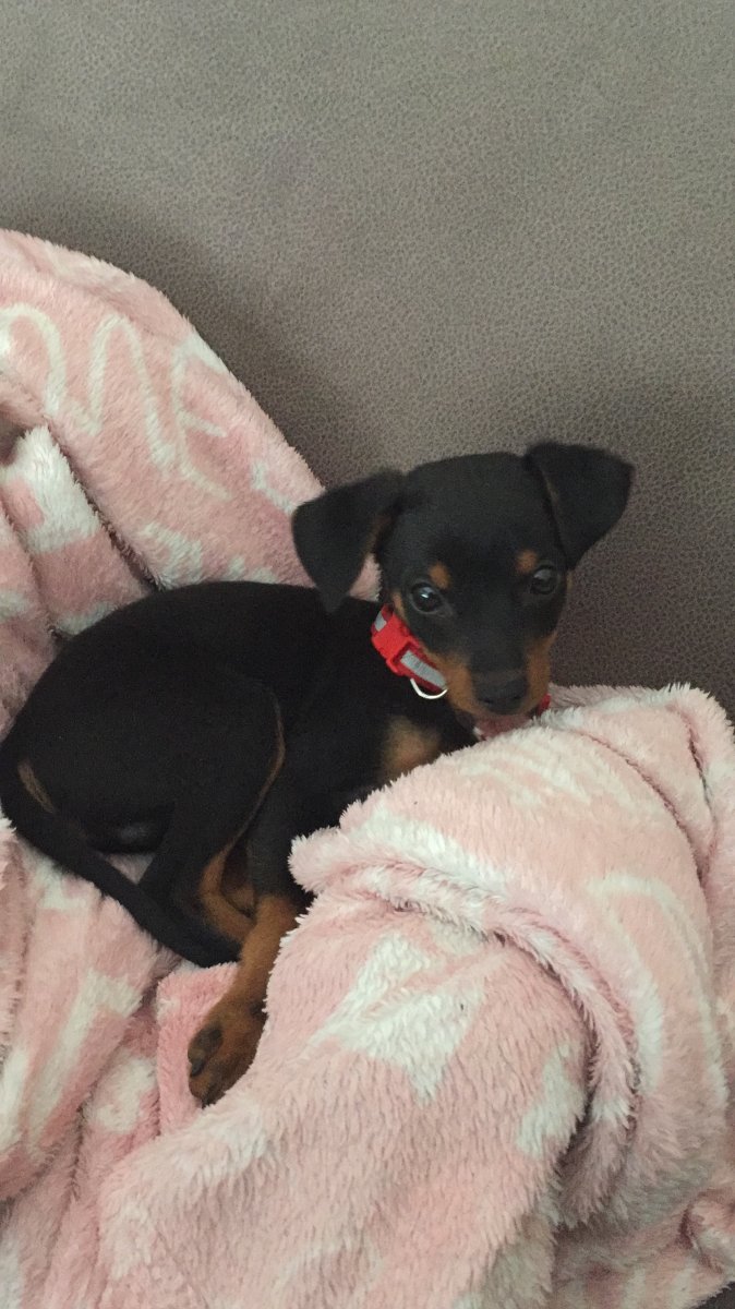 Kan je toch niet in de steek laten? Hier had ik hem pas. Een dwergpinscher, klein maar pittig. :-)
