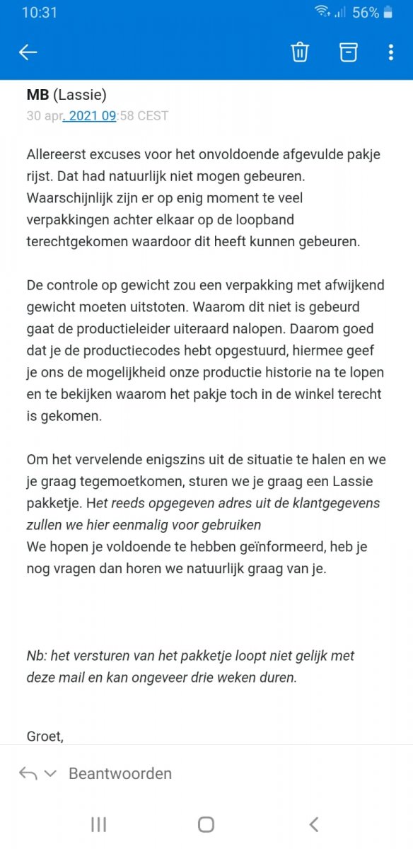Ging je nou een klacht indienen om die 10 gram?Ewa Lassie, geven ze mij 390 gram pandanrijst in plaats van de 400 gram die op de verpakking staat.