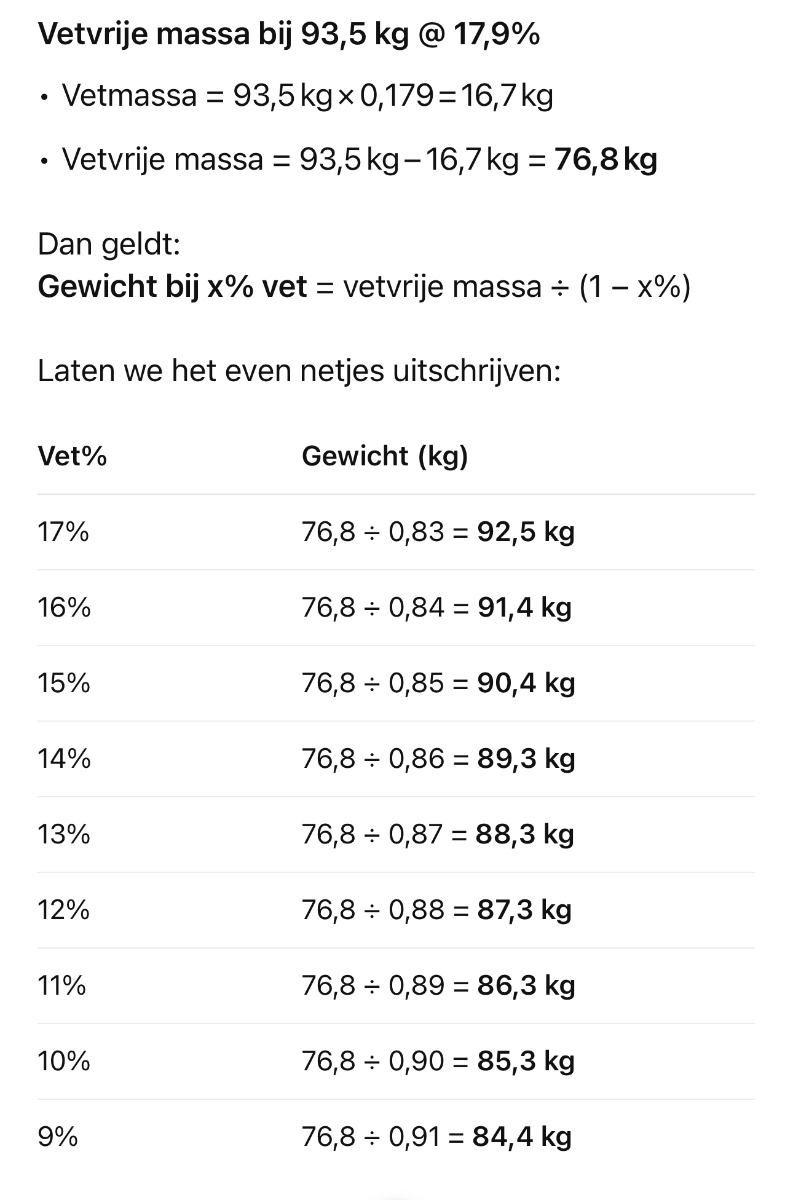 Volgens chatgpt zit ik op 13,5 a 14% op 88,4kg op basis van 93,5kg wegen op 17.9% (inbodyscan) Mijn doel is toch wel 8% want dan ben je volgensmij echt hard en grainy. Nog 4 a 5 kilovet te gaan dusZiet er ook goed uit, erg benieuwd hoe ver je het kan pushen 👍