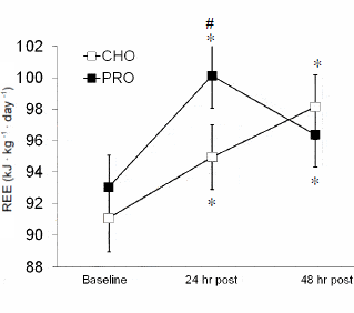 Hieronder zie je dat die ene shake het energieverbruik de dag na de training verhoogde. De suikershake zorgde voor een verhoogd energieverbruik van 3.5 procent, de eiwitshake verhoogde het energieverbruik met 8.5 procent.