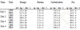 De tabel hieronder vertelt hoeveel energie, vet, eiwitten en koolhydraten de proefpersonen in totaal consumeerden. De eiwitshake-groep at over de dag niet meer eiwitten dan de koolhydraatshake-groep. De eiwit-inname van de sporters was so-wie-so aan de bescheiden kant.