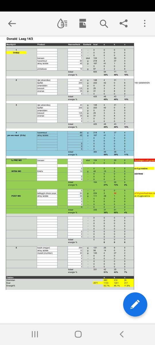Bij de totalen zijn de carbs en eiwitten van het gekleurde gedeelte meegeteld. Dus op rustdagen zit ik daaronder..Vet is te laag. 45g is minimum. 160/200g eiwit en de rest carbs. 285g eiwit heb je niet nodig